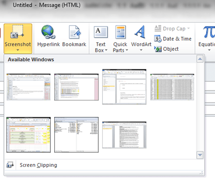 Insert screenshot in mail: The Outlook blog recently made an article on sending screenshots through email (http://blogs.msdn.com/outlook/archive/2010/04/28/sending-screenshots.aspx) . Although they focussed on the screen clipping part (which is not new as far as I know?) what caught my attention was in fact the part right above it in their screenshots. When composing a new e-mail, you can choose Insert->Screenshot. A dropdown list shows with …’lo behold…showing thumbs of each window currently active. Both minimized and hidden windows are shown.