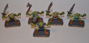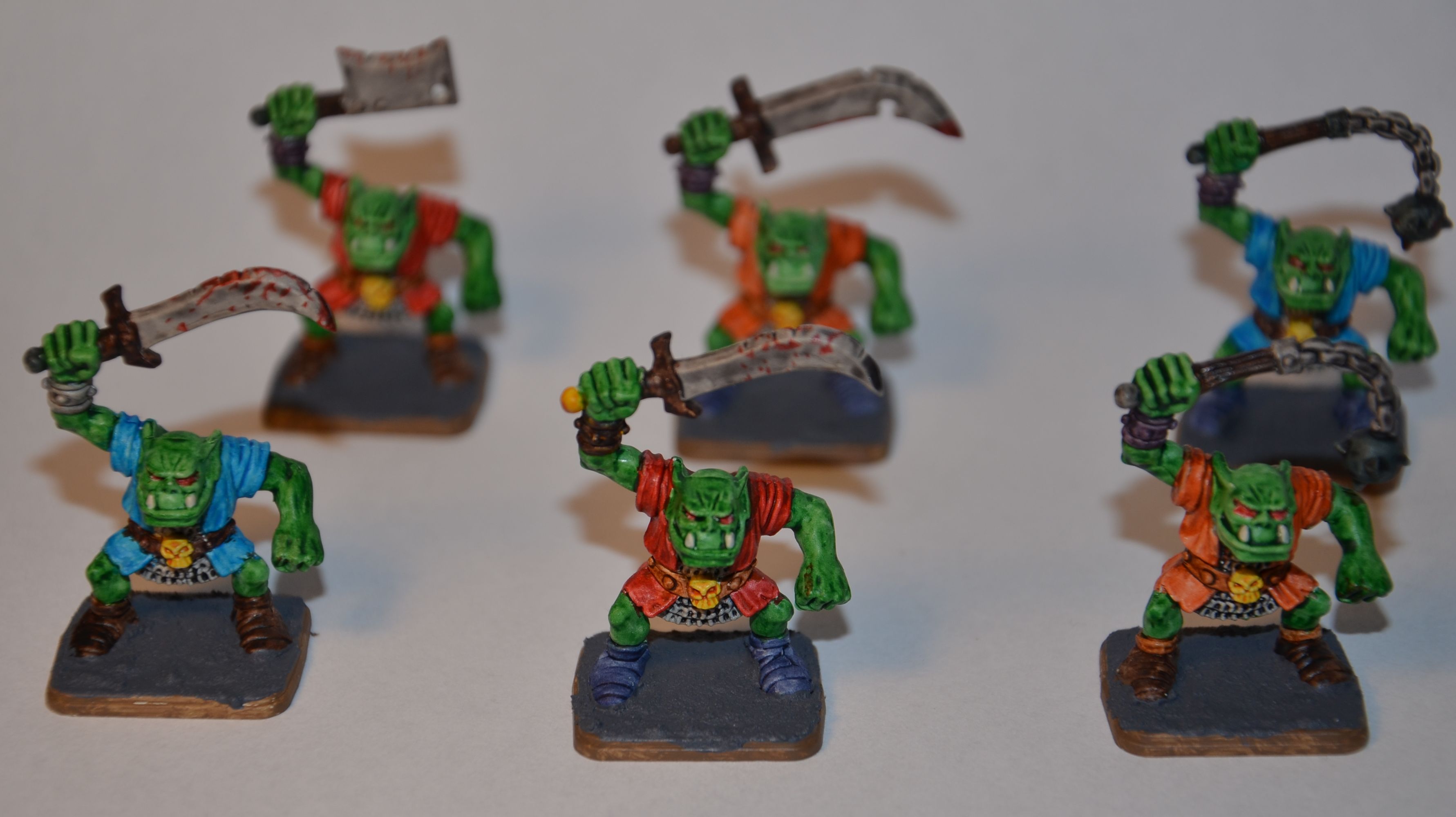 Next up where our big green friends, the orcs. I explicitly choose the orc flesh paint resulting in very cartoonish minis, which I really wanted. Some of the contrast paints are very bright and shiny, and so I choose those colours to have several different shirts.