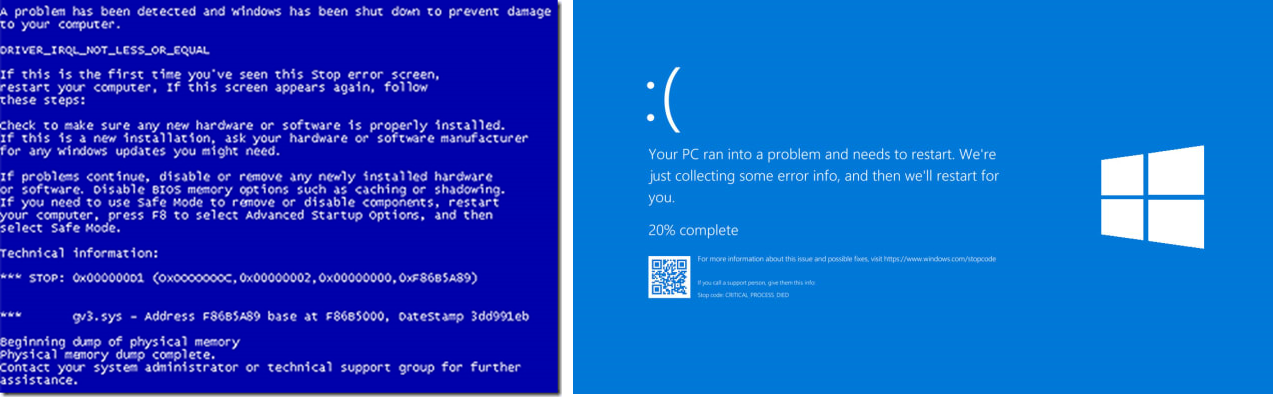 I really miss the old windows blue screen of death. Nowadays, if you’re lucky, you’ll get to what class of errors your crash belongs (e.g. “Critical process died”) and a rage-inducing sad smiley. Let’s not even mention a bl**dy QR-code, FFS. The Original BSOD, on the other hand, gave real helpful error information that one could use to scavenge the online documentation.