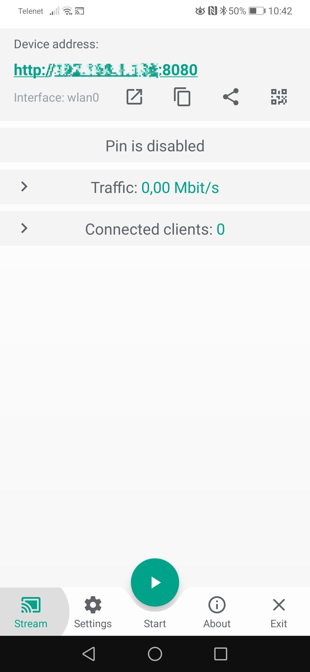Once you open the app, it will give you a local address (just make sure your smartphone is connected to the same network as your computer). Write down the address and then press the shiny play button in the button. Now your phone starts streaming (remember to turn it of afterwards). You can do anything you’d like on the phone.