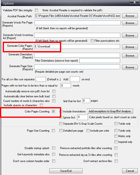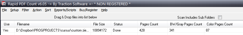 Identifying colour in a pdf is apparently something voodoo-like and depended of the printer that will actually print the pdf. There is, however, one little tool I discovered that will help you count and report which pages are in colour, called Rapid PDF Count. You need to explicitly tell it to count the colour pages (through the Setup menu-item, see the second image in this section) and you’ll then discover that this process really is something voodoo-like: even on my high-performance PC it almost took 5 minutes.