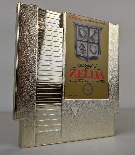 Plots stond er een sokkel voor me, met daarop een glazen kubus waarin een gouden relikwie werd beschenen door een mysterieuze gloed. Alsof er een goddelijk licht op viel. Het enige dat nog ontbrak was een koor dat zachtjes aanzwol naarmate ik het kleinood naderde. In die kubus lag een gouden Nintendo NES-cartridge. Geen gezever. Een GOUDEN cartridge. En niet zomaar één: op de cassette stond een schild afgebeeld met vier symbolen (twee hartjes, een sleutel en een leeuw – ik heb het moeten opzoeken, zo gedetailleerd is mijn herinnering nu ook weer niet), met daaronder in sierlijke letters The Legend of, gevolgd door grote rode blokletters: ZELDA.